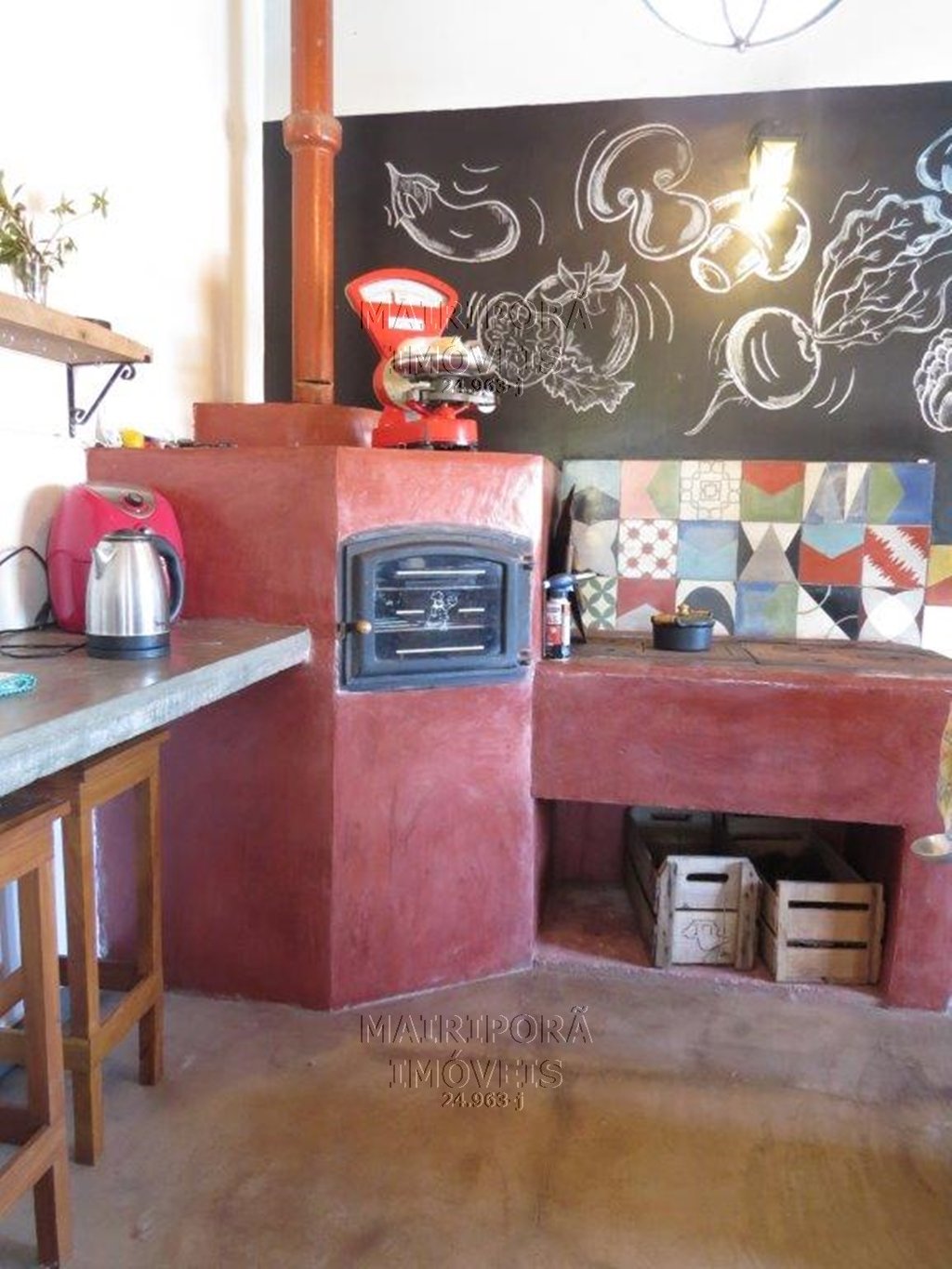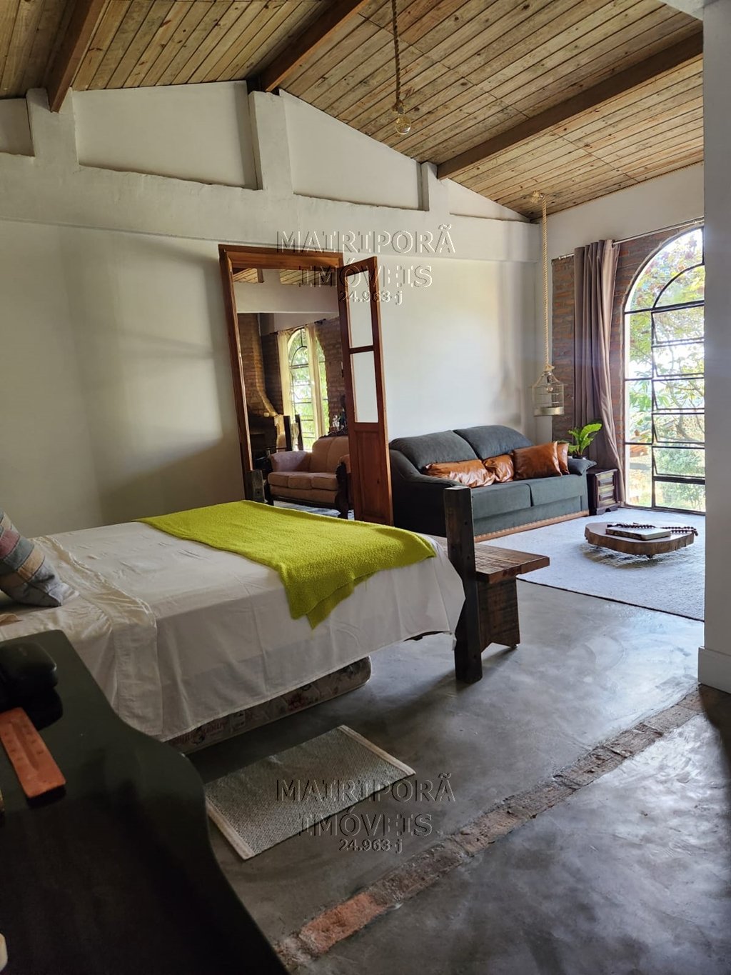 A casa principal traz três dormitórios com paredes em madeira, uma sala acolhedora com vista para a estrada e uma cozinha simplesmente encantadora — ilha central, detalhes em madeira de demolição, aquele rústico elegante que mistura charme e sofisticação na medida certa.